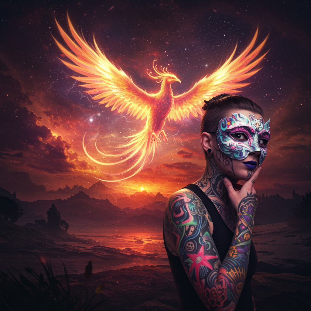 A surreal digital illustration featuring an abstract blend of vibrant colors and ethereal forms, where a fiery phoenix emerges from a swirling nebula, its luminous wings casting a kaleidoscope of reflections on an otherworldly landscape; in the foreground, a masked figure, gender ambiguous and adorned with intricate tattoos that pulse with the colors of the nebula, gazes with an enigmatic expression, reflecting a sense of mystery and allure, perfectly captured in the intimate frame of a pfp, echoing the allure of hidden worlds and untold stories.
