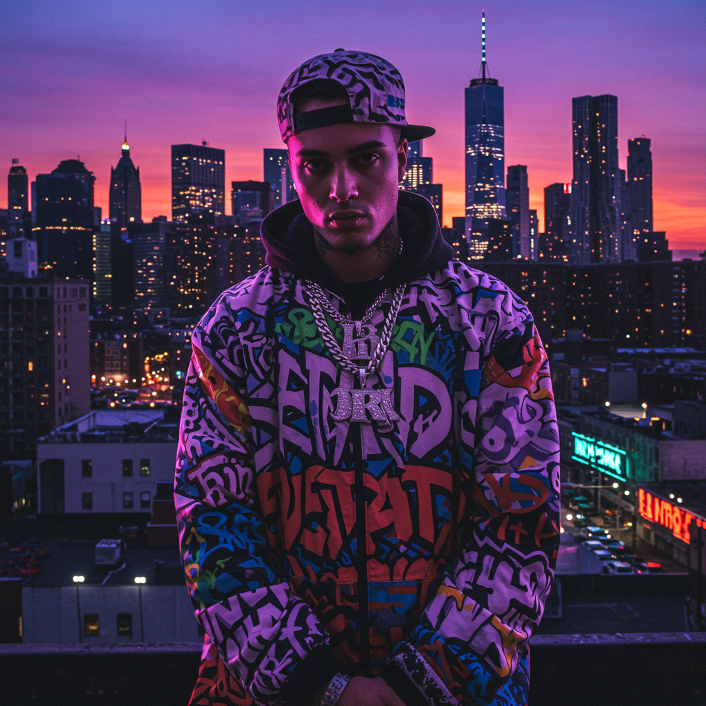 An electrifying NYC drill vibe radiates from the image, with a gritty urban backdrop showcasing the iconic New York City skyline under a dusky purple sunset. The foreground features a fashionable individual wearing a bold, trendy streetwear outfit with vibrant graffiti patterns, their expression conveying intensity and creativity. They’re adorned with chunky silver chains and a tilted baseball cap, exuding confidence and raw energy. In the background, the faint glow of neon lights from bustling city streets contrasts with the serene overhead sky, encapsulating the pulse and rebellion of NYC drill culture.