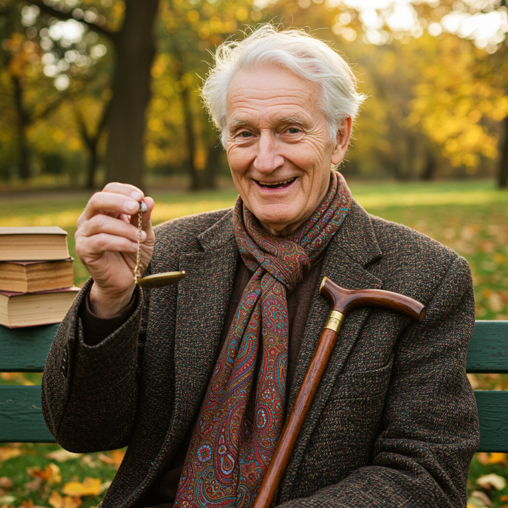 An elderly gentleman with a kind and wise face, his silver hair gently tousled by the wind, wearing a classic tweed jacket with a colorful paisley scarf. He’s sitting on a rustic wooden bench in a sun-dappled park, surrounded by autumn leaves. His eyes twinkle with youthful mischief as he holds a vintage pocket watch in one hand, symbolizing the passage of time balanced with eternal curiosity. The background hints at a life rich with stories, showcasing a stack of old books and an antique walking cane resting by his side. The image exudes warmth, wisdom, and a sense of timeless adventure.