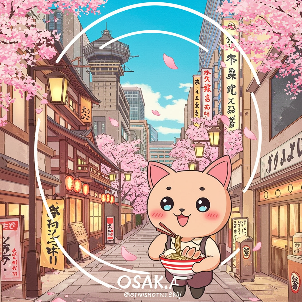 A whimsical anime-style profile picture featuring a vibrant scene of an Osaka street during cherry blossom season, with pastel pink petals gently floating through the air. The background showcases a mix of traditional Japanese architecture and modern skyscrapers bathed in the warm glow of neon lights. In the foreground, a charming character with expressive, sparkling eyes and a trendy outfit holds a steaming bowl of ramen, embodying the essence of Osaka's culture and energy. The image captures a sense of adventure, blending the historic and contemporary soul of the city into a captivating and colorful persona.