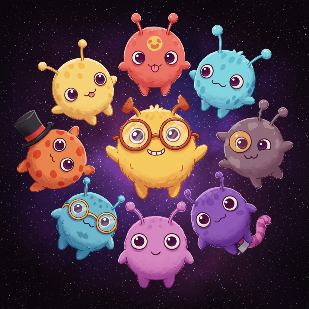 A vibrant digital illustration showcases a group of seven quirky and whimsical creatures known as the Ot7 Quanny, each with unique features and colors, harmoniously arranged in a circular formation against a cosmic backdrop. The central creature sports oversized glasses and a mischievous smile, exuding an aura of playful curiosity. Surrounding it, the other six creatures display diverse expressions and accessories, like a tiny top hat, a monocle, or peculiar antennae, highlighting their individuality. This enchanting and lively pfp captures the essence of unity and diversity, perfect for expressing a multifaceted personality on social media.