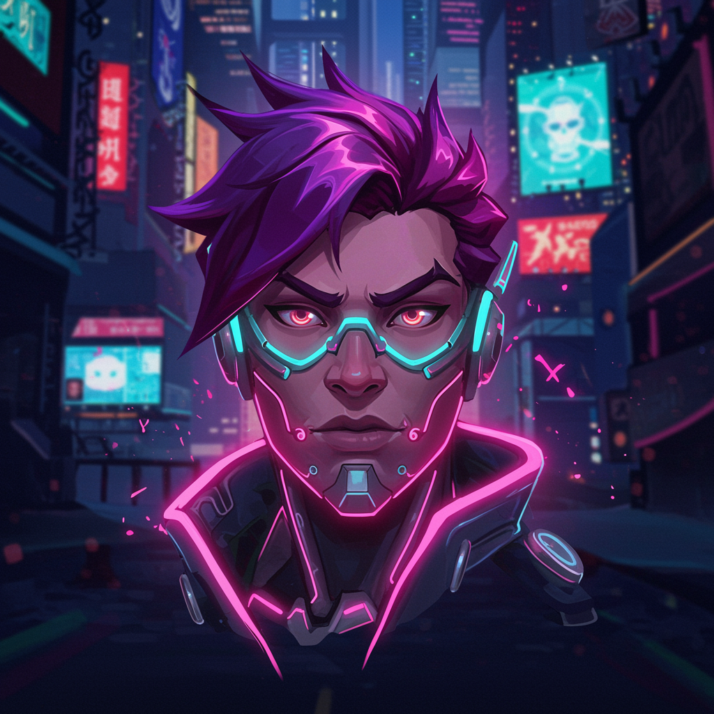 Create an energetic and vibrant Overwatch-inspired profile picture featuring a stylized, neon-lit version of your favorite hero's face, set against a dramatic, futuristic cityscape backdrop. The hero's iconic features are accentuated with dynamic light trails and subtle hints of glowing circuitry, reflecting their unique abilities, while the background showcases towering skyscrapers and holographic billboards that echo the game's cybernetic theme.