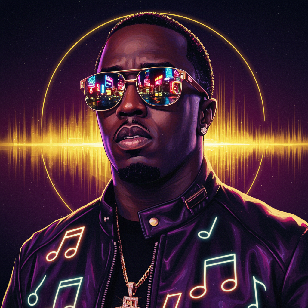 Imagine a vibrant digital portrait that captures the essence of P Diddy with a futuristic twist. The image features P Diddy looking confidently into the distance, donning sleek, high-tech sunglasses that reflect a cityscape of neon lights. His iconic style is highlighted by a bold leather jacket adorned with glowing musical notes. In the background, a dynamic wave of sound visualizations symbolizes his impact on the music industry, creating an aura of rhythmic energy around him. A subtle golden glow emanates from the edges of the image, suggesting an aura of influence and sophistication. This pfp embodies the charisma and innovation of P Diddy in a visually striking piece.