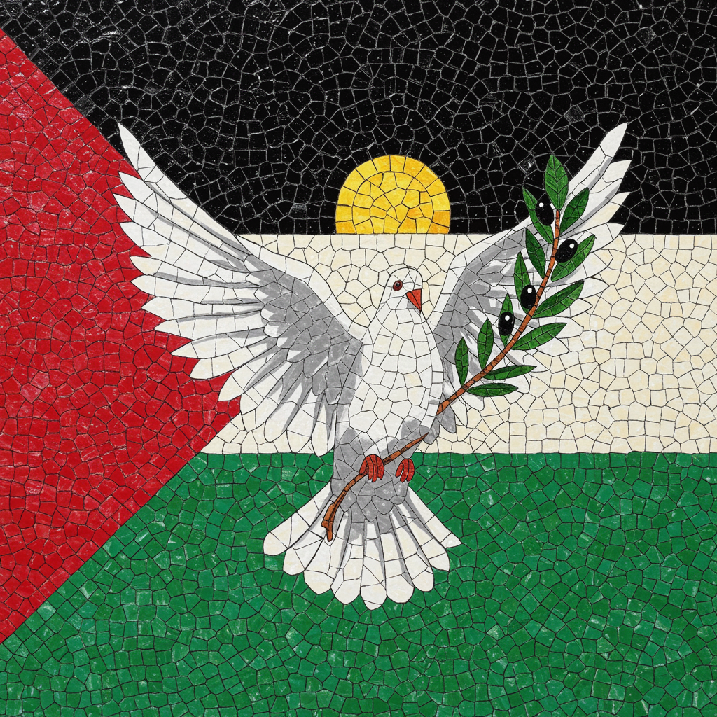 A vibrant and harmonious mosaic of a dove with outstretched wings intertwined with olive branches, set against a backdrop of the Palestinian flag's distinct colors, with the sun softly illuminating the scene to symbolize peace, hope, and unity, capturing the essence of cultural heritage and identity in a single emblematic pfp.