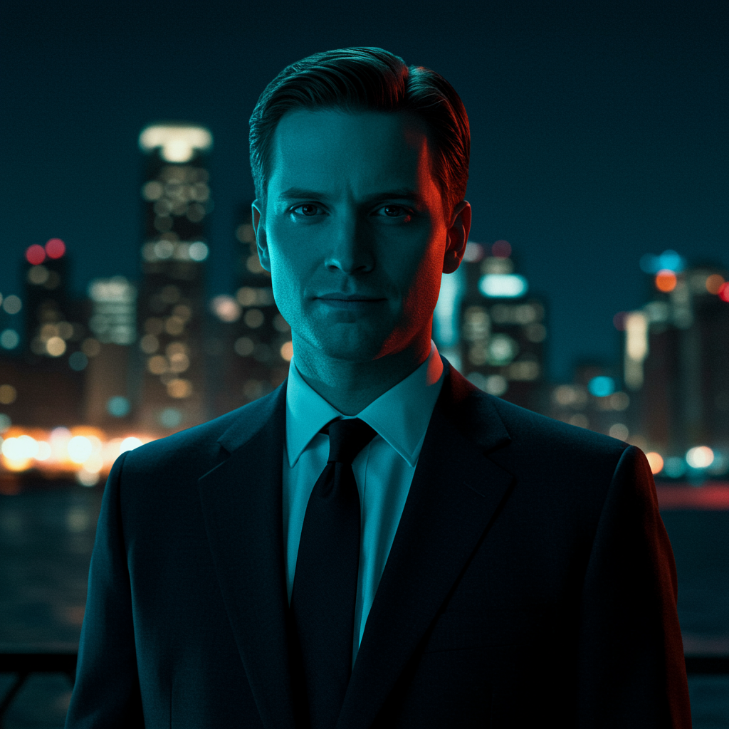 Imagine a sleek and polished profile picture that encapsulates the essence of Patrick Bateman's charm and complexity. Visualize a sharply dressed, impeccably groomed figure in a sophisticated suit, standing against a backdrop that hints at the opulence and mystery of a bustling cityscape at night. The city lights cast an eerie glow on his features, with a subtle smirk playing on his lips, juxtaposing the allure of high society with an underlying hint of menace. The flashing neon lights reflect in his eyes, capturing the duality of a character who is both captivating and enigmatic, making this pfp a mesmerizing blend of charisma and intrigue.