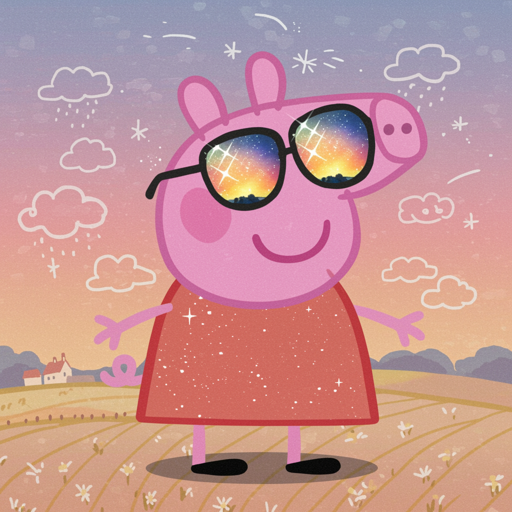 Imagine a playful and whimsical profile picture featuring a stylized version of Peppa Pig, adorned with a vibrant and modern twist. Picture Peppa wearing oversized sunglasses that reflect a sparkling sunset over a serene countryside. Her iconic pink complexion is enhanced with a splash of cosmic colors, as if painted with the hues of the galaxy. In the background, delicate doodles of clouds and stars dance around her, adding a dreamlike aura. The overall vibe is trendy and charming, blending nostalgia with a touch of contemporary art flair, capturing the essence of a fun-loving, imaginative spirit perfect for a social media presence.