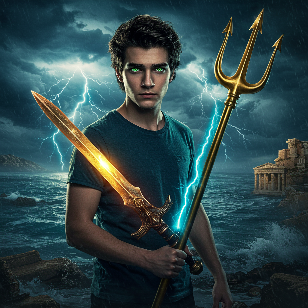 "An enigmatic profile picture depicting a modern-day demigod inspired by Percy Jackson, featuring a young hero with sea-green eyes and tousled dark hair, standing confidently with a celestial bronze sword in one hand and a shimmering blue-and-gold trident in the other; behind them, the turbulent sea meets a stormy sky, with flashes of lightning illuminating the clouds, while ancient Greek ruins peek through the mist, hinting at epic quests and hidden mysteries intertwined with the essence of legendary mythology."
