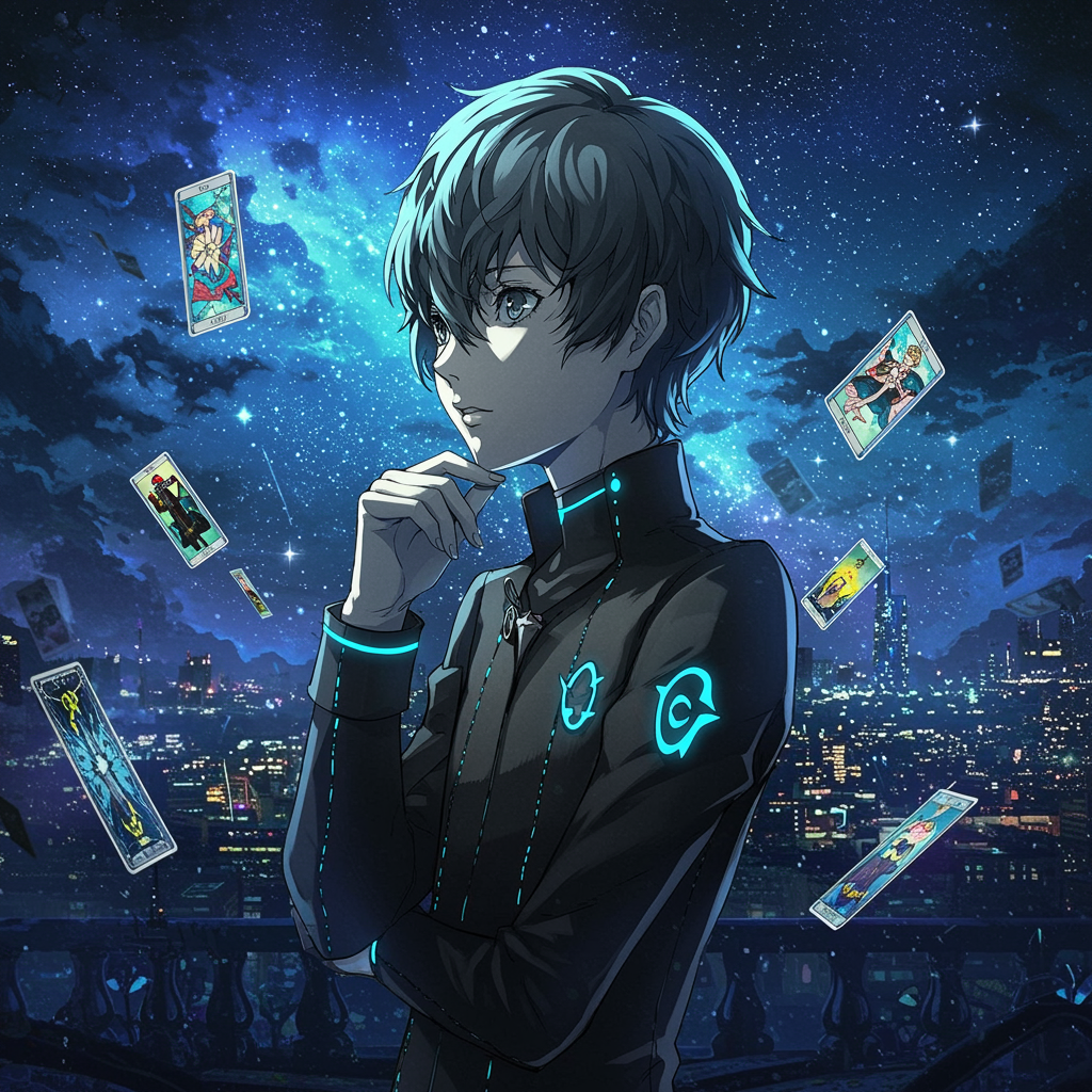 A mystical persona 3 pfp showcasing an anime-inspired character gazing thoughtfully, adorned in a sleek, futuristic school uniform with glowing blue accents; the background is a dreamlike fusion of dark velvet and cerulean hues, hinting at a digital cityscape that merges reality with a surreal, celestial sky speckled with stars and floating tarot cards, evoking an enigmatic aura and a sense of introspective adventure.