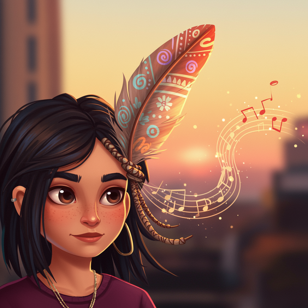 Imagine a vibrant and dynamic profile picture where a whimsical feather is intricately woven into the hair of a stylish urban avatar, symbolizing both lightness and resilience. The feather is adorned with patterns and colors reminiscent of Mexican culture, subtly transforming into musical notes as it trails off, embodying the essence of Peso Pluma—a metaphor for layering identity, music, and art. The backdrop shimmers with soft hues of dawn, suggesting new beginnings and the fusion of tradition with modernity, bringing to life an image that captivates and represents an individual's unique narrative on social media.