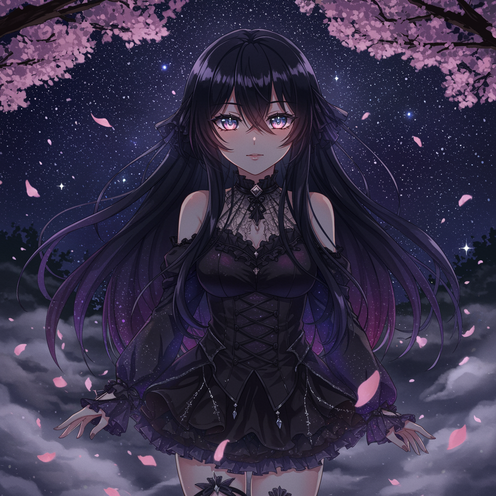 A captivating profile picture featuring a mysterious dark anime girl with long flowing jet-black hair that blends seamlessly into a night sky filled with twinkling stars, her eyes glowing with an otherworldly iridescence, adorned in a gothic-inspired outfit with intricate lace and shimmering embellishments, surrounded by ethereal wisps of fog and gentle cascades of cherry blossom petals, exuding an aura of enchanting beauty and enigmatic allure.