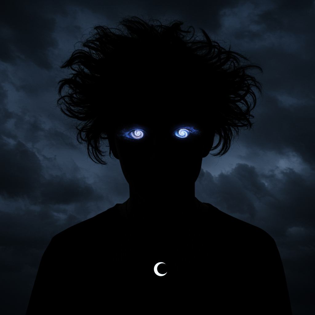 A shadowy figure stands against a backdrop of swirling midnight clouds, their silhouette illuminated by an eerie, soft glow emerging from a crescent moon necklace; their eyes are a mesmerizing blend of galaxy swirls, reflecting distant stars and secrets untold, hinting at a mysterious aura, as ethereal wisps of mist weave through their tousled raven hair, offering glimpses of a hidden world within the darkness.
