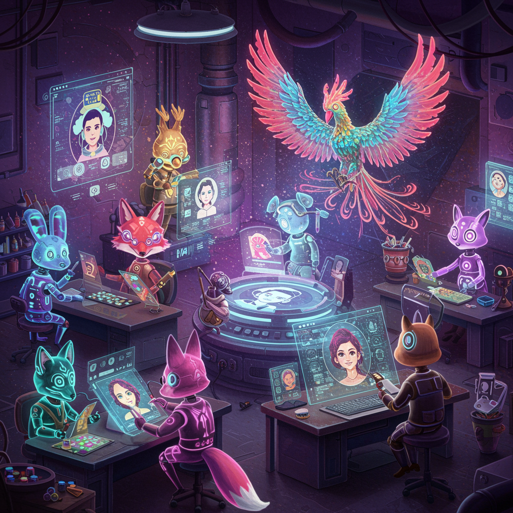 Create an image of a futuristic digital workshop, a vibrant and whimsical space where a diverse array of fantastical creatures, from neon cybernetically-enhanced foxes to shimmering kaleidoscopic phoenixes, are collaborating in harmony to design intricate profile pictures. Each creature is equipped with luminescent, holographic tools and surrounded by a swirling galaxy of digital textures and colors, as they meticulously hone striking designs that reflect the soul and story of the users they represent. The entire scene pulsates with a sense of creativity, innovation, and the boundless potential of personal expression in the digital realm.