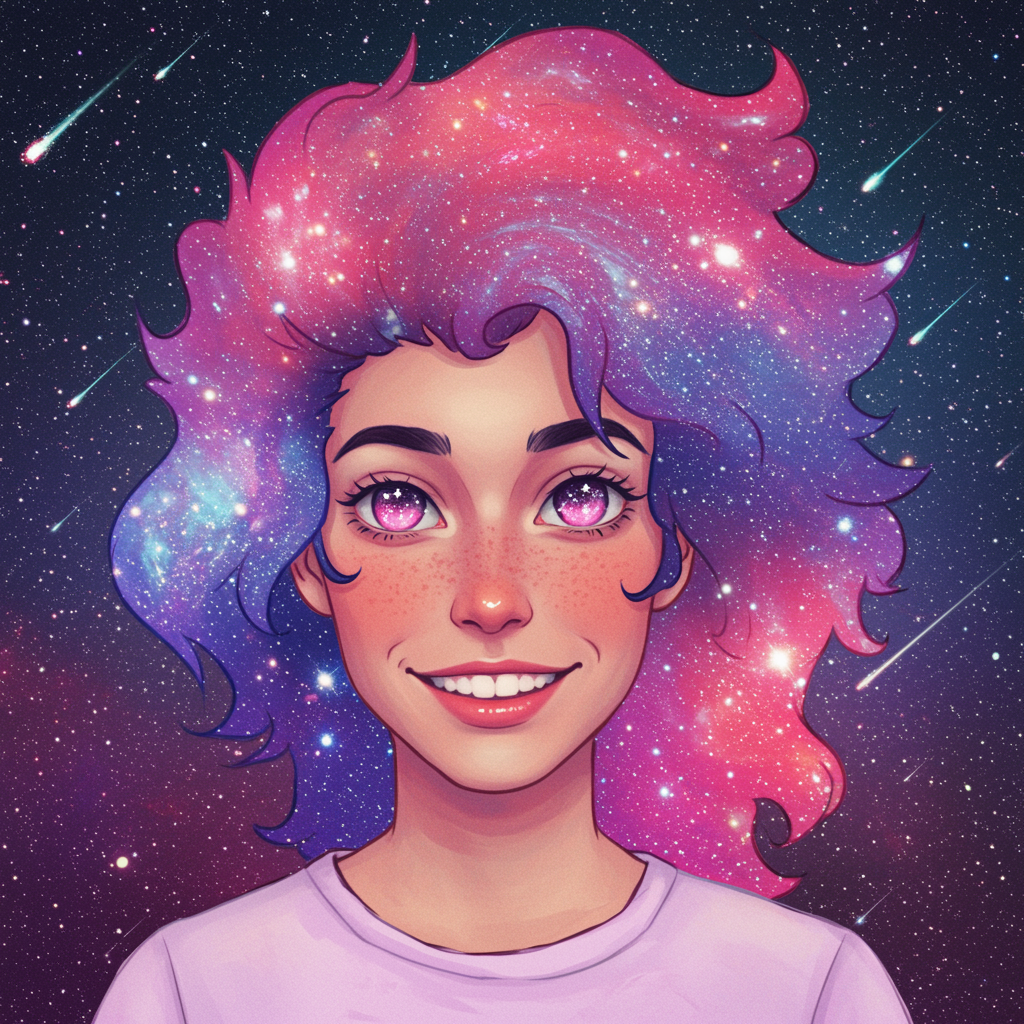 Imagine a whimsical and vibrant portrait of a person with an ethereal aura, set against a cosmic backdrop filled with swirling galaxies and shooting stars, their hair transforms into a cascade of shimmering nebulae, with eyes that glimmer like the surface of distant planets, and an enigmatic smile that evokes mystery and intrigue; this image perfectly encapsulates the essence of individuality and limitless exploration, capturing the imagination and drawing the viewer into a world where the boundaries between reality and fantasy blur, making it the perfect pfp for insta.