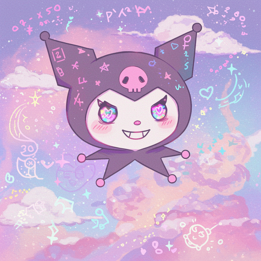 A whimsical digital portrait of Kuromi, adorned with a mischievous grin, set against a vibrant, dreamy backdrop of swirling pastel clouds and sparkling stars. Her iconic jester hood is playfully reimagined with prismatic accents, and her expressive eyes are alight with a hint of mystery and youthful rebellion. Ethereal wisps of pixelated smoke weave around her, blending into an enchanting pattern of magical symbols and quirky doodles, capturing a sense of playful chaos and creative energy. The image is both captivating and charming, perfectly encapsulating Kuromi’s edgy yet cute persona, making it an ideal avatar for someone with a spirited and rebellious online presence.