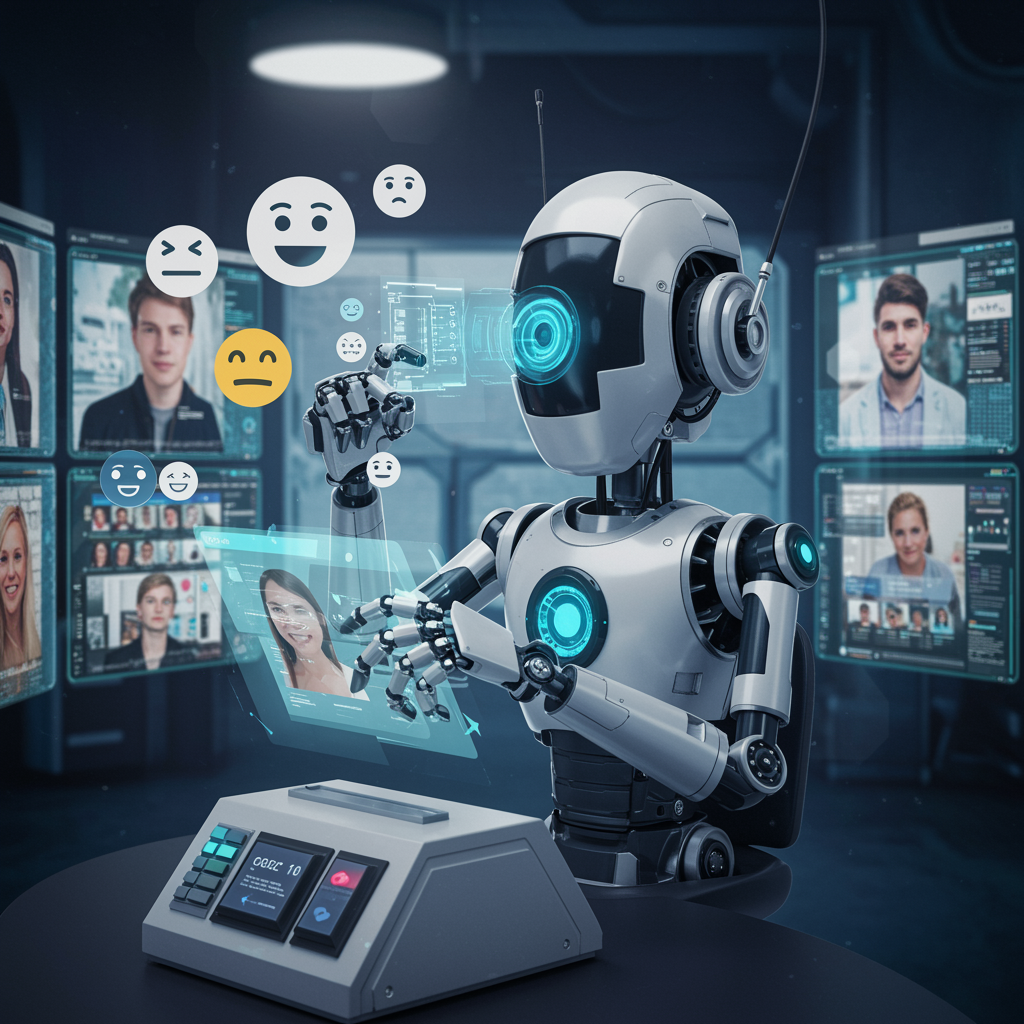 Create an imaginative pfp tester where a futuristic robot, with features designed specifically for testing and analyzing profile pictures, sits in a vibrant digital lab filled with screens displaying diverse social media profiles, its robotic eye glowing with curiosity and precision as it examines each image, surrounded by floating holographic icons representing different emotions and personalities.
