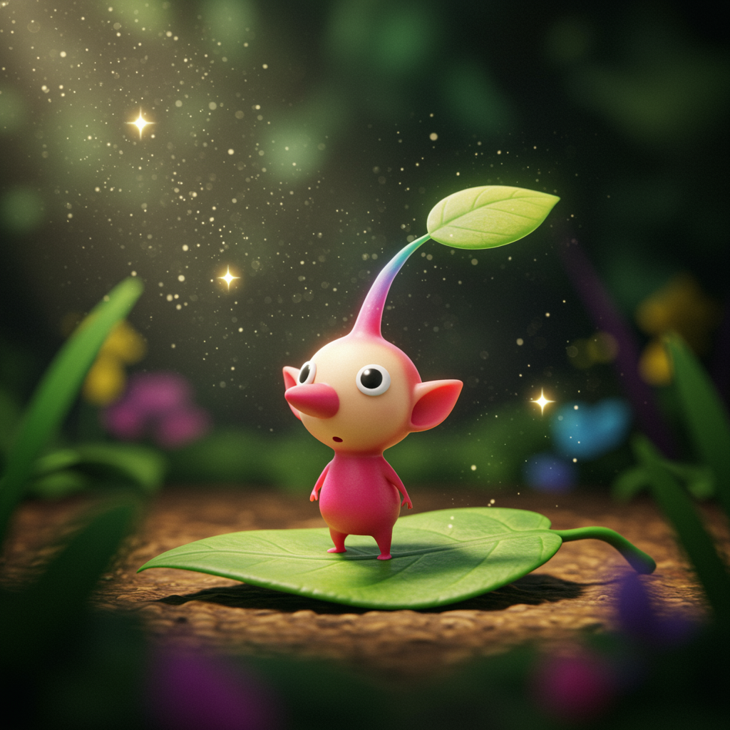 Imagine a whimsical forest scene where a vibrant and adventurous Pikmin stands proudly on a small leaf, its tiny eyes full of curiosity and determination. Surrounding it are delicate sparkles that dance in the sunlight filtering through the canopy above, while colorful, miniature flora and fauna share their magic in the background, creating an enchanting atmosphere. The Pikmin’s antenna glows faintly, symbolizing potential and unity, inviting viewers into its world with an infectious sense of exploration and wonder. This image captures the essence of a playful and spirited pfp, perfect for someone who cherishes imagination and adventure in their online presence.