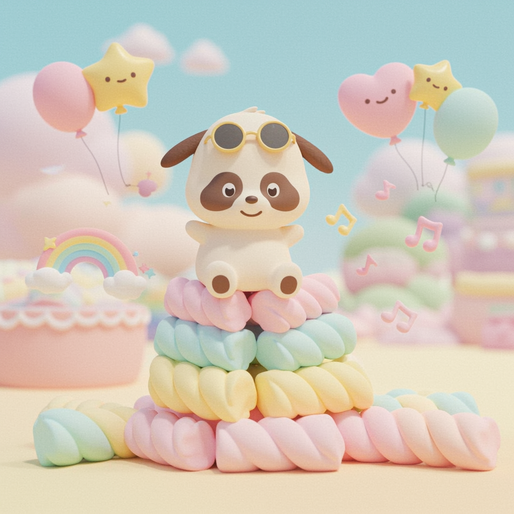 Imagine a vibrant, animated scene featuring Pochacco, the lovable Sanrio dog character, sitting playfully atop a stack of colorful marshmallows. The background brims with soft, pastel hues, creating a dreamy, whimsical atmosphere. Pochacco is adorned with a tiny, stylish pair of sunglasses perched on his nose, adding a touch of coolness. Around him float whimsical items like balloons shaped like stars and hearts, a small rainbow arching over his head, and musical notes that seem to dance in the gentle breeze. This enchanting and cheerful image is perfect as a profile picture, capturing the joyful and adventurous spirit of Pochacco in a world where fantasy meets delight.