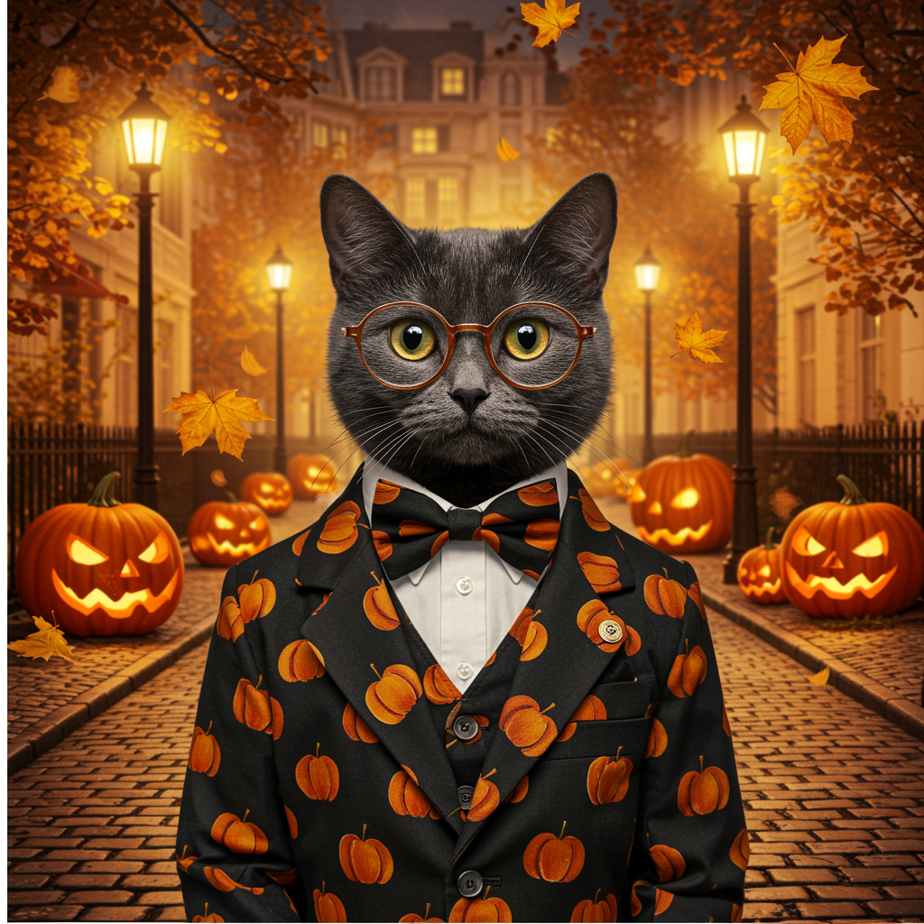 Imagine a preppy Halloween profile picture featuring a charming mix of vintage and modern aesthetics: picture a well-dressed black cat wearing a sleek, tailored blazer with subtle pumpkin patterns, and a bowtie that matches the soft autumnal hues of falling leaves. The background is alive with the soft glow of carved pumpkins, casting gentle shadows over an elegant, cobblestone street lined with wrought-iron lampposts. A few golden leaves flutter down as the cat, with an air of sophistication and mystery, coyly peers over its tortoiseshell eyeglasses, embodying both the spookiness and chic elegance of a preppy Halloween.