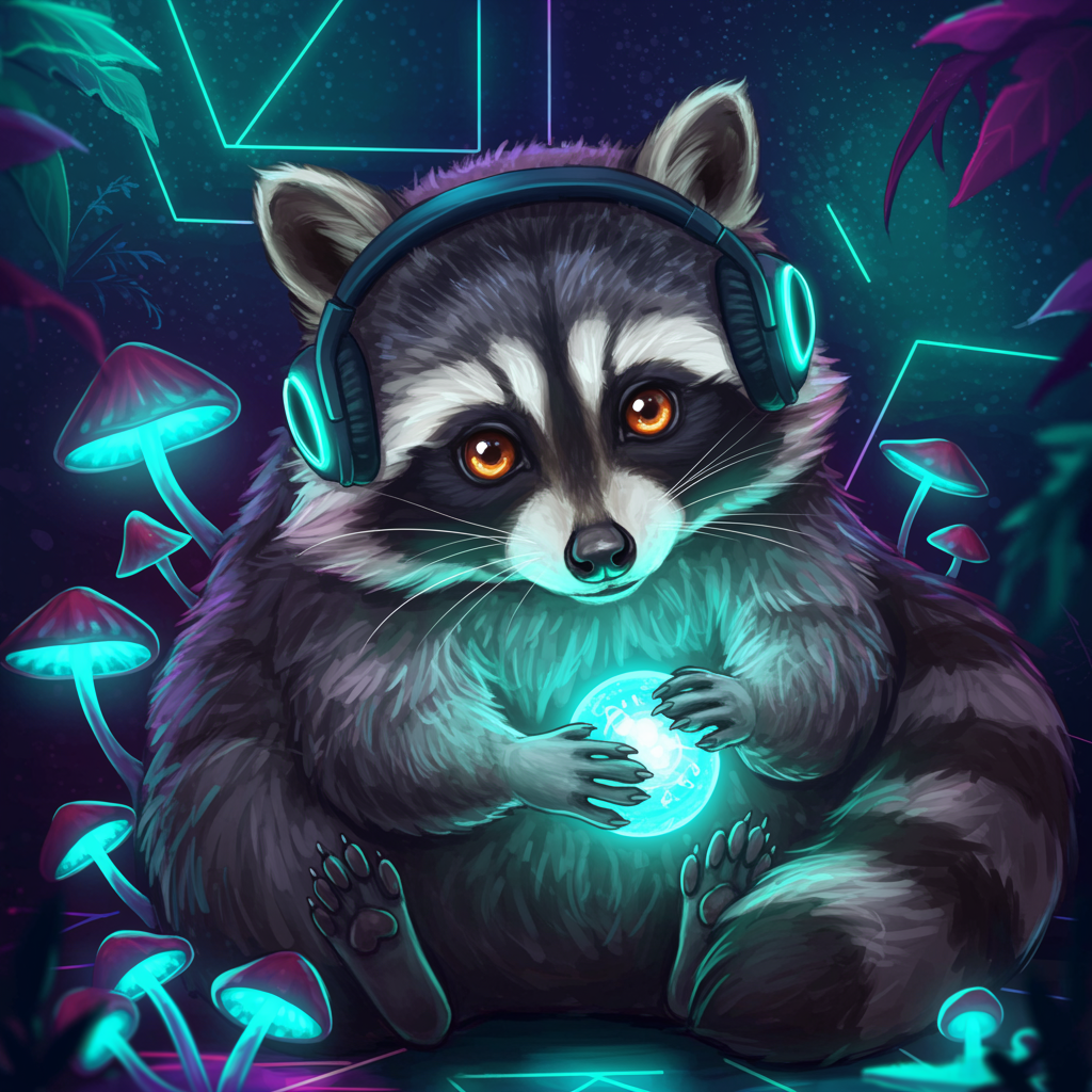 A whimsical raccoon with sparkling amber eyes, wearing an oversized pair of neon headphones, nestled in a cozy corner of a vibrant, futuristic forest. Its fur shimmers with metallic hues of teal and silver under the glow of bioluminescent fungi. The background is a mosaic of glowing geometric shapes, and the raccoon's paws hold a small, glowing orb, casting playful reflections on its mischievous face. This striking balance of nature and technology encapsulates the raccoon's curious spirit and modern edge, perfect for an eye-catching social media pfp.