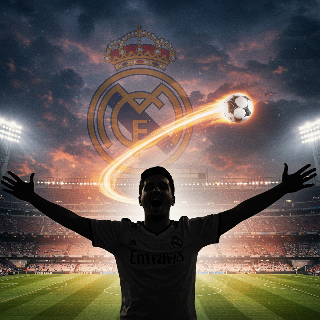 A dynamic and vibrant image capturing the essence of Real Madrid; imagine a digital collage blending iconic elements like the Santiago Bernabéu Stadium, the Real Madrid crest subtly incorporated into the sky, and a football trailing a comet-like streak across the scene; in the foreground, a silhouette of a fan with outstretched arms in jubilation, their face adorned with a spirited expression of devotion, all bathed in the glow of stadium lights, creating a powerful representation of passion and allegiance that encapsulates the spirit of Real Madrid for the perfect social media profile picture.