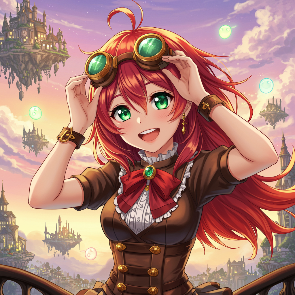 A whimsical anime-inspired scene featuring a vibrant red-haired girl with sparkling emerald eyes, her hair cascading like fiery waterfalls against a pastel sky; she playfully adjusts oversized steampunk goggles perched on her head while tiny, luminescent orbs flutter around, casting an enchanting glow—and in the background, a fantastical cityscape with floating islands and towering clockwork structures subtly frames her captivating smile.