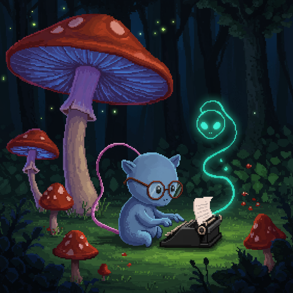 A whimsical profile picture for a Reddit user: imagine a playful fusion of internet culture and fantasy where a pixelated cyber-forest teems with glowing digital mushrooms, each casting a vibrant hue onto a small, enigmatic creature sporting oversized glasses and typing furiously on a vintage typewriter, its long tail spiraling into the air and forming the recognizable alien logo subtly hidden among the surreal foliage.