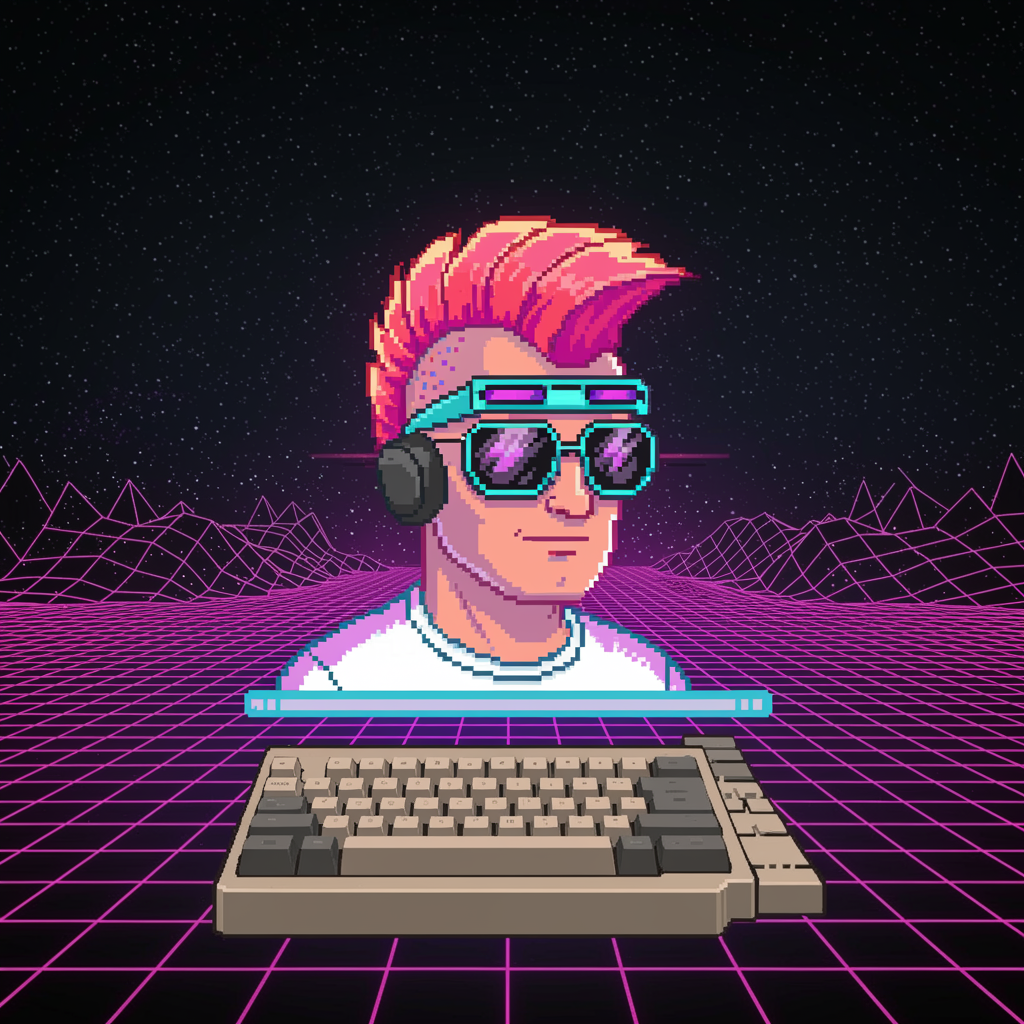 Imagine a retro pfp that captures the essence of 1980s nostalgia: a pixel-art character with a neon-colored mohawk and aviator sunglasses, wearing a classic arcade T-shirt, framed by a vintage computer interface that boasts pastel grids and vibrant geometric shapes against a starry digital horizon.