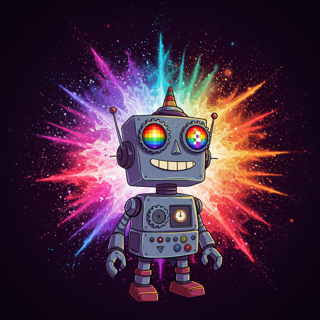 A vibrant explosion of retro-futuristic elements, featuring a playful robot with rainbow-colored gears, its eyes sparkling with mischievous digital patterns. The background showcases a swirling galaxy of neon colors and abstract shapes, giving an impression of limitless energy and joy. The robot's metallic body reflects an array of colors, making it look like a playful guardian of creativity and technology merged with boundless fun.