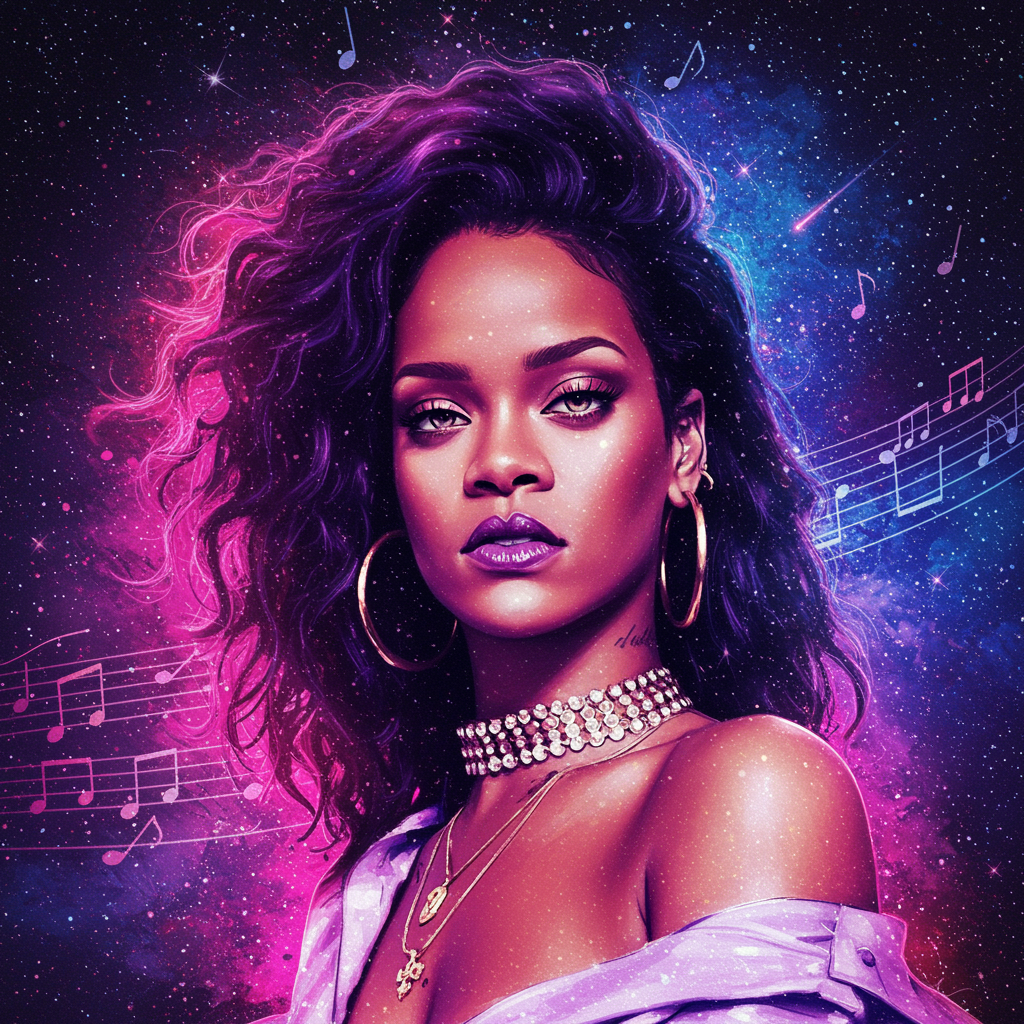 Imagine a vibrant, digital portrait of Rihanna as a celestial goddess, her eyes shimmering with stardust and her hair flowing like a cosmic nebula, against the backdrop of an abstract night sky where musical notes dance like shooting stars, capturing her iconic style and enigmatic aura in a single captivating pfp.
