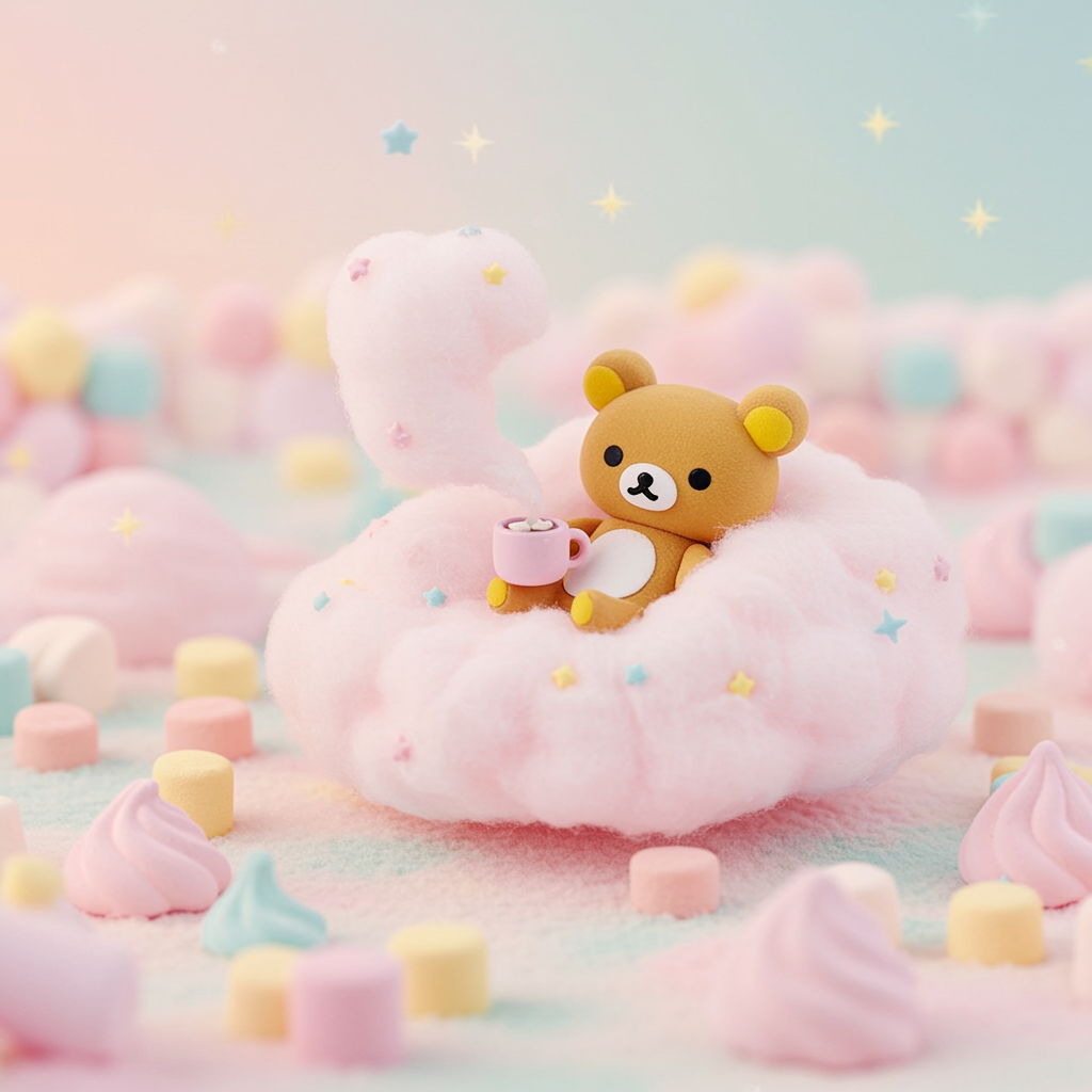 Imagine a cozy, pastel-themed setting where Rilakkuma is lounging on a cloud made of fluffy cotton candy, surrounded by miniature dream-like landscapes of oversized, colorful marshmallows and tiny twinkling stars. The background has a gentle gradient, moving from soft pink into pale blue, evoking a serene sunset. Rilakkuma, with a relaxed and content expression, is holding a tiny mug of steaming hot cocoa, its swirling steam blending into the cloud. This enchanting and whimsical scene captures the essence of comfort and relaxation, perfect for a charming and endearing pfp.