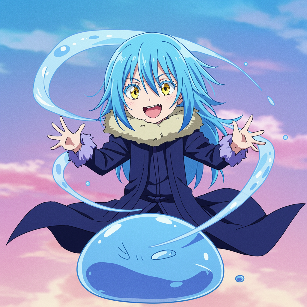Create a captivating profile picture featuring Rimuru Tempest, the charismatic slime from anime, showcasing his vibrant azure hue with a mystical aura. Envision him with a playful yet powerful expression, surrounded by ethereal wisps of energy that seem to dance around him like a serene storm, reflecting both his whimsical and formidable nature. The background should be a dreamy blend of swirling pastels, seamlessly capturing the enchanting allure of a fantasy realm, while the overall composition exudes a sense of adventure and limitless potential.