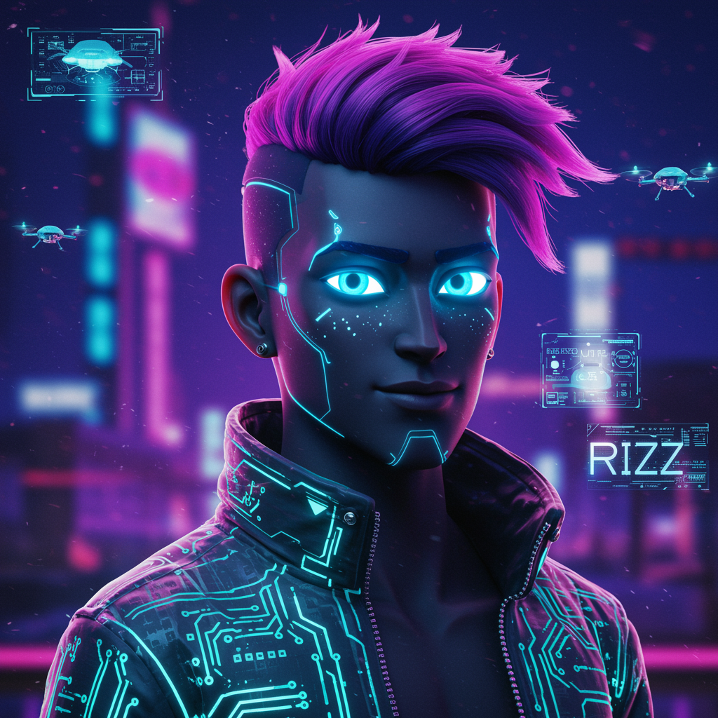 Imagine a sleek, futuristic cyberpunk avatar with luminous, neon-blue eyes and a confident expression. The character sports a stylish asymmetrical haircut with streaks of electric purple. They wear a high-tech, reflective jacket with intricate circuitry patterns. In the background, a vibrant cityscape glows with towering holograms and floating drones, adding a sense of mystery and allure to this charismatic digital persona. The pfp exudes a sense of charm and effortless cool, embodying the essence of "rizz."