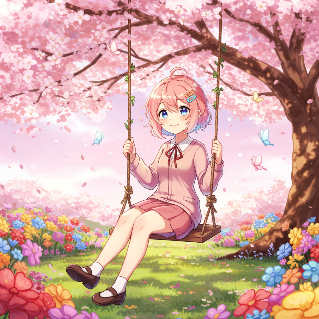 A whimsical digital illustration of Sayori, a bubbly and cheerful character known for her vibrant personality, in a serene garden. She's sitting on a swing under a cherry blossom tree, gently swaying with a soft, dreamy smile. Sunlight filters through the petals, creating a dappled shadow on the ground. With pastel-colored butterflies flitting around her and an array of colorful flowers blooming at her feet, Sayori's joyful essence shines through. Her signature pink hair is adorned with a small rainbow hairclip, perfectly capturing her spirited aura for a captivating and delightful profile picture.