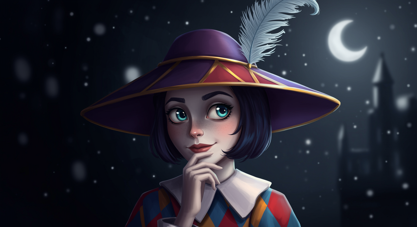 A whimsical character gazing thoughtfully from the shadows, adorned in an elaborate hat with a single feather fluttering in an imaginary breeze, their eyes sparkling with a hint of mischief under delicately arched eyebrows, a colorful harlequin pattern cloaks their shoulders while soft moonlight adds a silvery sheen to the scene, evoking an air of mystery and theatrical charm that captures the enigmatic essence of a scaramouche in a strikingly personal way, perfect for a captivating profile picture.