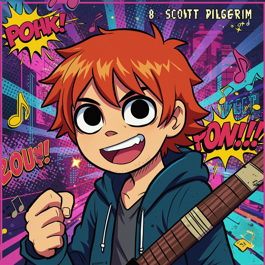 "Imagine a vibrant and energetic profile picture capturing the essence of Scott Pilgrim in anime form, where the character exudes a dynamic blend of playful rebellion and indie spirit. His eyes twinkle with mischievous determination, set against a background of pulsating neon cityscapes and retro 8-bit graphics. The scene brims with kinetic movement, as musical notes and comic book style action words pop around him, reflecting his dual world of epic rock battles and romantic quests. This image should convey a sense of youthful exuberance and nostalgia, promising thrilling adventures with every glance."