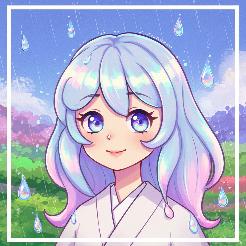 A vibrant and whimsical profile picture featuring Shizuku, a character with flowing, iridescent hair resembling a cascade of shimmering raindrops. Her large, expressive eyes glimmer with curiosity and wonder, set against a backdrop of lush, dreamlike landscapes that evoke the serenity of a gently falling rain. Delicate water droplets dance around her, catching the light and creating a mosaic of pastel hues that add a touch of magic and serenity to her presence. Shizuku's gentle smile and graceful pose exude a sense of calm and introspection, making this profile picture a perfect representation of tranquility and creativity.