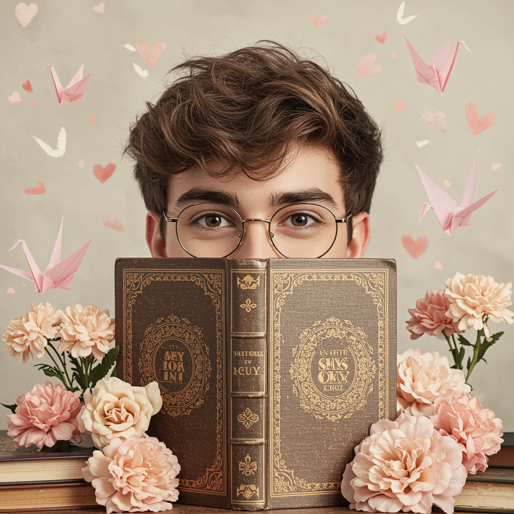 A whimsical and endearing shy guy pfp where a bespectacled young man with tousled hair and a gentle smile peeks out from behind a vintage book, only half of his face visible, surrounded by an assortment of soft pastel flowers and fluttering paper cranes, evoking a sense of sweet vulnerability and quiet introspection in a dreamy, ethereal atmosphere.