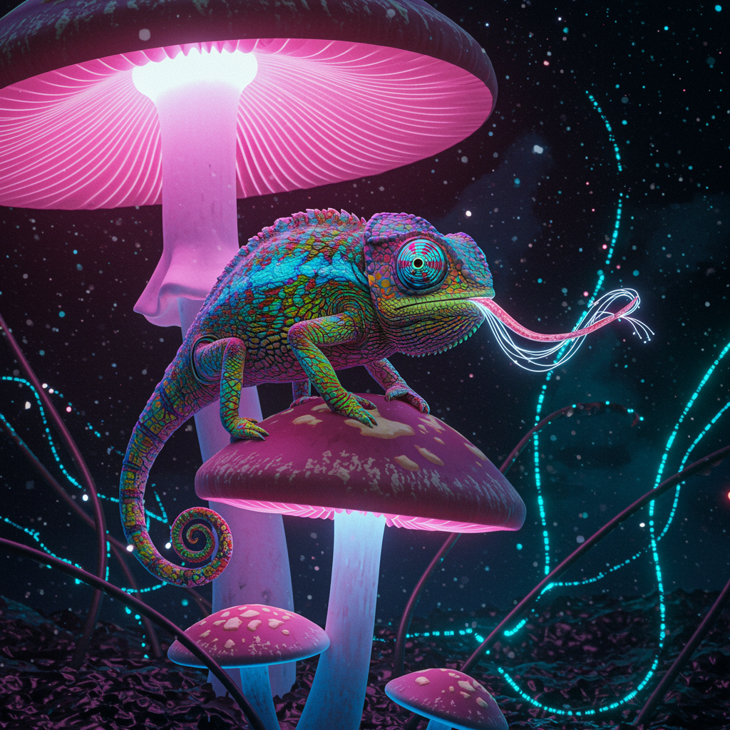 Imagine a surreal and vibrant digital artwork featuring a futuristic cyborg chameleon perched atop a giant glowing mushroom; its eyes are like swirling galaxies, and its skin shifts through a mesmerizing spectrum of neon colors. Behind it, electric vines of data flow like streams of luminescent liquid light across a dark, cosmic landscape, hinting at the limitless realms of cyberspace. The chameleon’s tongue elegantly woven with fiber optics reaches out to taste the digital air, capturing the essence of a 'sick pfp' that merges technology and nature in a dazzling visual symphony.