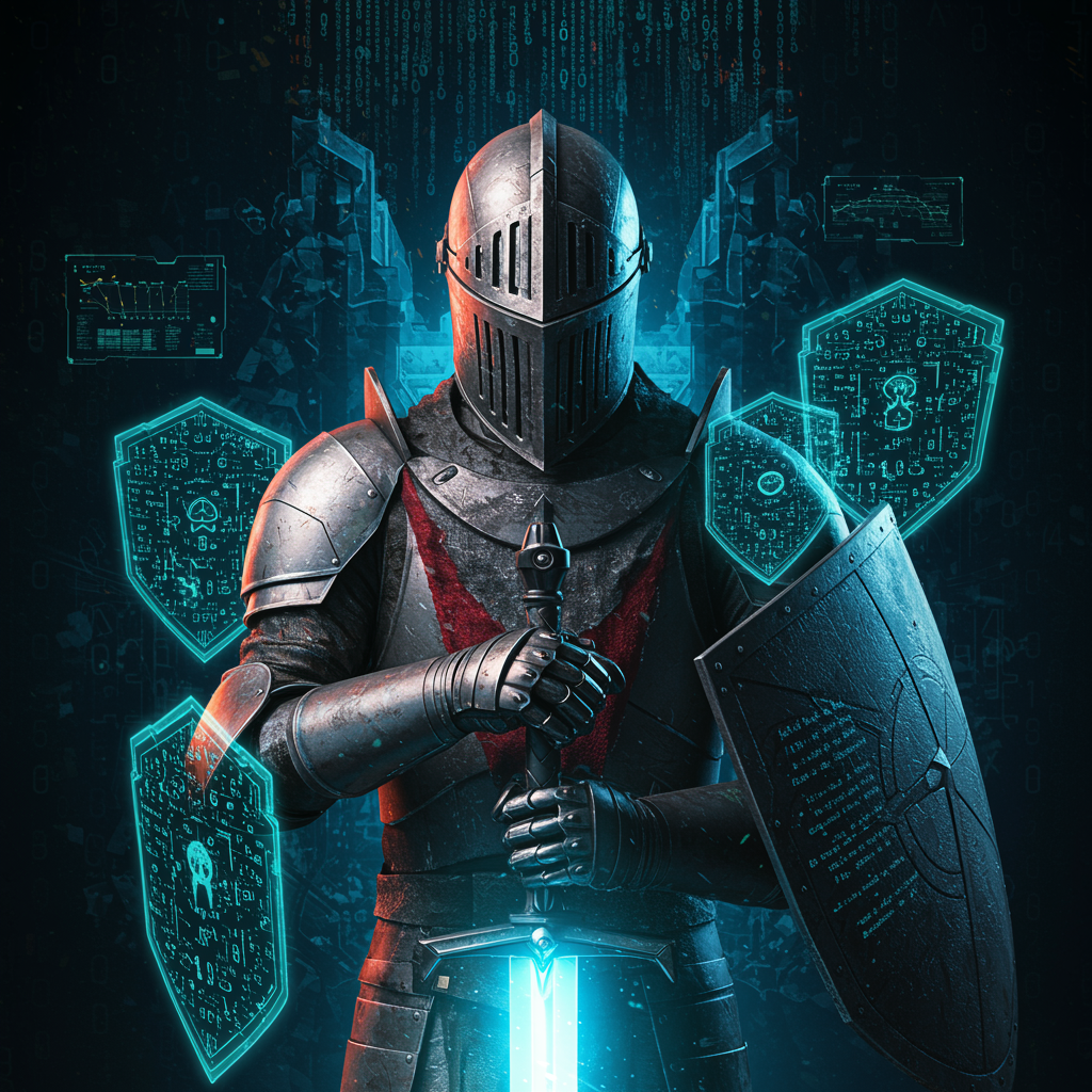 A futuristic knight clad in sleek, metallic armor stands resolute against a backdrop of a digital nexus, his helmet's visor reflecting a swirling chaos of neon codes and symbols. The knight's gauntlet rests confidently on the hilt of a glowing, ethereal sword, surrounded by floating holographic shields that pulse with vibrant colors. Behind him, a fortress of interlocking binary towers looms, guarded by sentinels of pure energy. This siege-themed profile picture captures the essence of a digital warrior prepared to defend a citadel of data in the virtual realm.