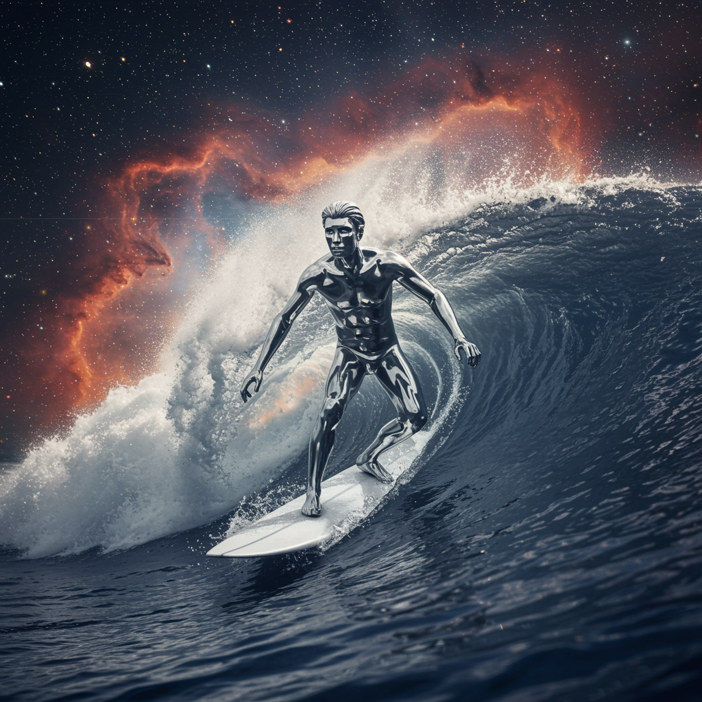An ethereal silver surfer riding a shimmering cosmic wave, the galactic backdrop swirling with vibrant nebulas and distant stars, their form sleek and metallic, reflecting the vastness of space, eyes glinting with cosmic wisdom, encapsulating the essence of interstellar exploration and timeless coolness, perfect for a profile that radiates otherworldly elegance and adventurous spirit.