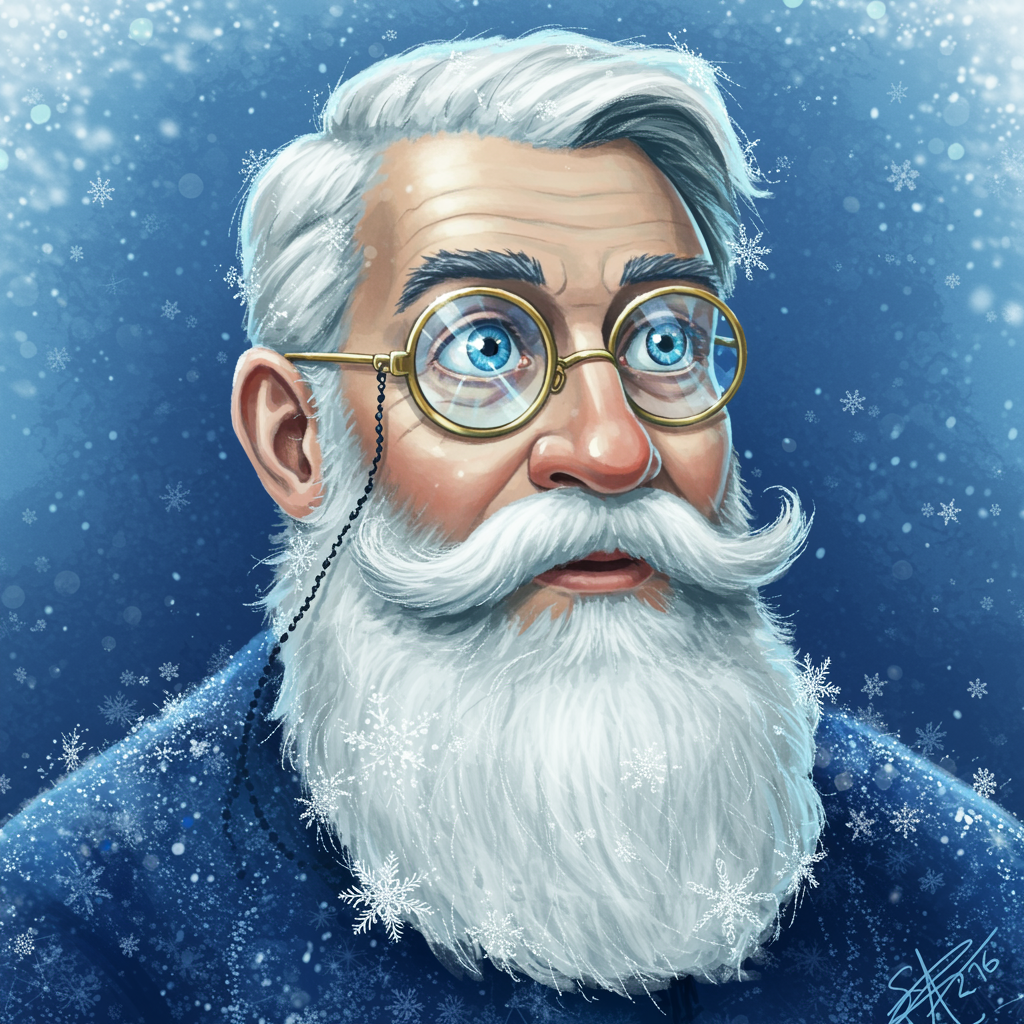 A whimsical portrait of Simon Petrikov, encapsulated in an icy blue hue, with twinkling snowflakes adorning his white beard, captured in a moment of curious wonder—a kaleidoscope reflected in his monocle, evoking a sense of whimsical enchantment amidst the delicate balance of madness and brilliance.