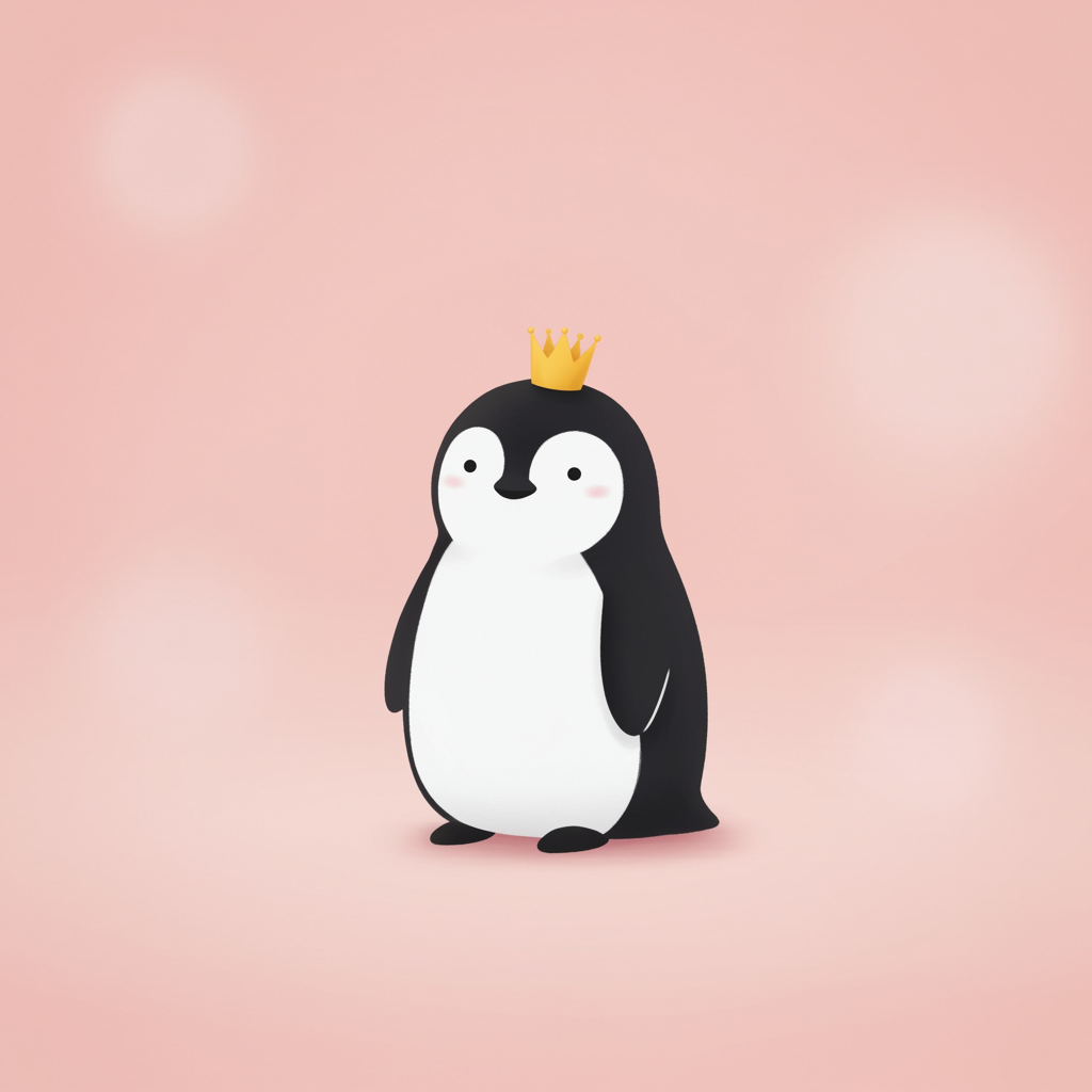 A minimalist penguin with a tiny crown, set against a soft pastel background, its gentle smile conveying warmth and approachability.