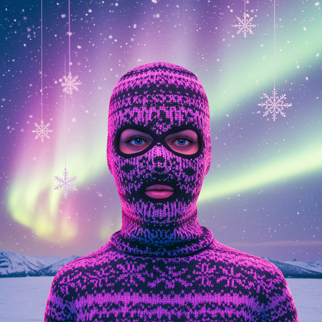 Imagine a vibrant and surreal winter landscape, where a figure stands confidently against a backdrop of swirling pastel-colored auroras. This enigmatic character sports a ski mask, intricately knitted with bold geometric patterns and vibrant hues reminiscent of cosmic constellations. The eyes behind the mask glow with an intense curiosity, reflecting the kaleidoscope of colors in the sky. Around this figure, delicate snowflakes hang suspended in the air, frozen mid-dance, like tiny stars caught in a moment of intrigue. This image captures the juxtaposition of mystery and allure, inviting anyone who gazes upon it to wonder about the story behind this dazzling persona.