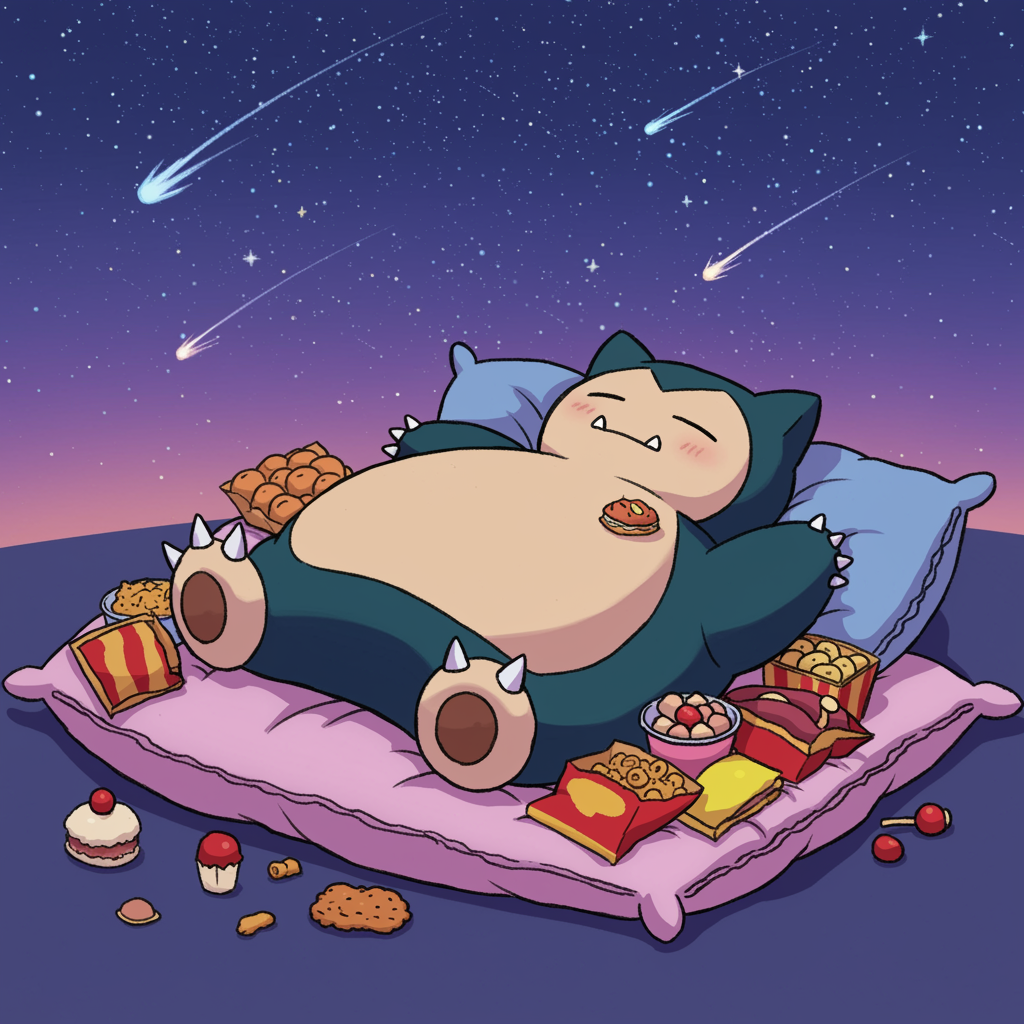 A whimsical and playful illustration of a Snorlax lounging lazily on a fluffy, oversized pillow surrounded by a colorful array of midnight snacks, with an expression of serene contentment as shooting stars twinkle above in a dreamy twilight sky, capturing the essence of peaceful relaxation and joyful abundance.