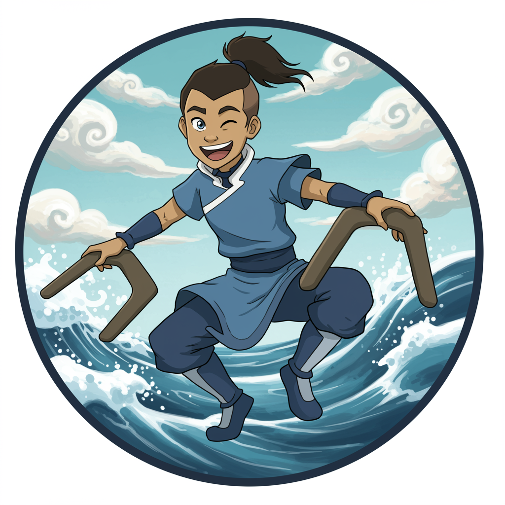 A vibrant digital illustration capturing Sokka from Avatar: The Last Airbender, sporting a playful expression with his signature ponytail and boomerang in hand, set against a dynamic backdrop of swirling clouds and ocean waves, reflecting his adventurous spirit and connection to both water and air elements, all wrapped in a circular frame that highlights his character as both a warrior and a strategist, perfect for a profile picture that showcases both his humor and leadership qualities.