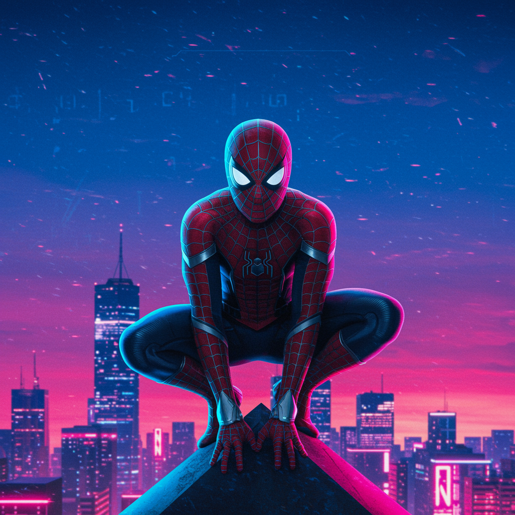 Imagine a vibrant, dynamic composition for a profile picture that captures the essence of a "Spider-Man pfp aesthetic": envision Spider-Man perched atop a futuristic cityscape at dusk, the skyline aglow with neon lights reflecting off glass-paneled skyscrapers. His iconic suit is reimagined with a sleek, cyberpunk twist, combining traditional elements like webbing and the spider emblem with glowing circuit patterns. The backdrop is a swirling mix of electric blues and pinks, blending into the deep indigo of the impending night. His eyes, a glowing white, convey a sense of vigilance and mystery as if guarding the digital realm. Shadows and highlights play across his form, creating a sense of motion and depth, while the city below buzzes with the energy of virtual connectivity, hinting at a blend of heroism and technological prowess in this modern reimagining of an iconic character.