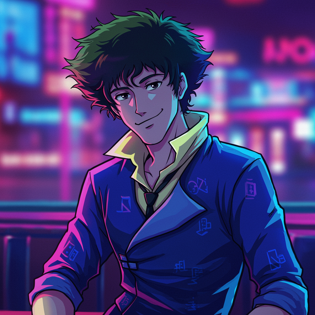 A stylized image of Spike Spiegel, the iconic bounty hunter from "Cowboy Bebop," sitting casually in a futuristic café, with a playful smirk on his face. He's wearing his signature blue suit, but it's updated with neon accents and digital patterns that reflect the cyberpunk aesthetic. The background is an abstract blur of vibrant city lights, giving a sense of movement and energy. Spike's hair is slightly tousled, with exaggerated spikes, as if caught in a gentle breeze. His eyes are sharp and focused, conveying both mystery and charm. The overall color palette is a mix of deep blues, electric purples, and glowing neon greens, capturing the essence of a cool and enigmatic persona perfect for a modern profile picture.