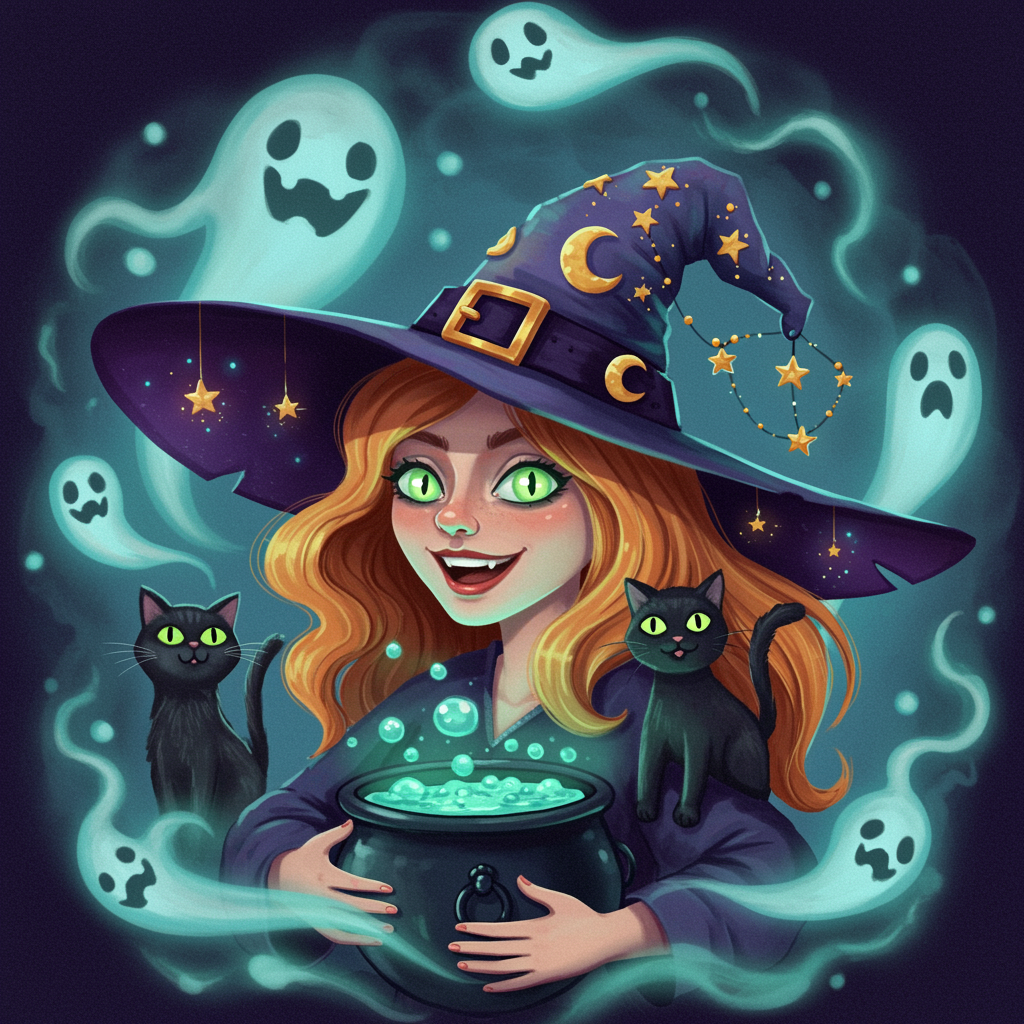 Imagine a whimsical witch with glowing green eyes and a mischievous grin, surrounded by a swirling mist of eerie purple and blue, wearing a wide-brimmed hat adorned with crescent moons and tiny, sparkling stars; she holds a bubbling cauldron filled with mysterious, swirling colors, while a friendly black cat perches on her shoulder and wisps of spectral, smiling ghosts dance playfully in the background, capturing the perfect essence of a spooky Halloween profile picture.