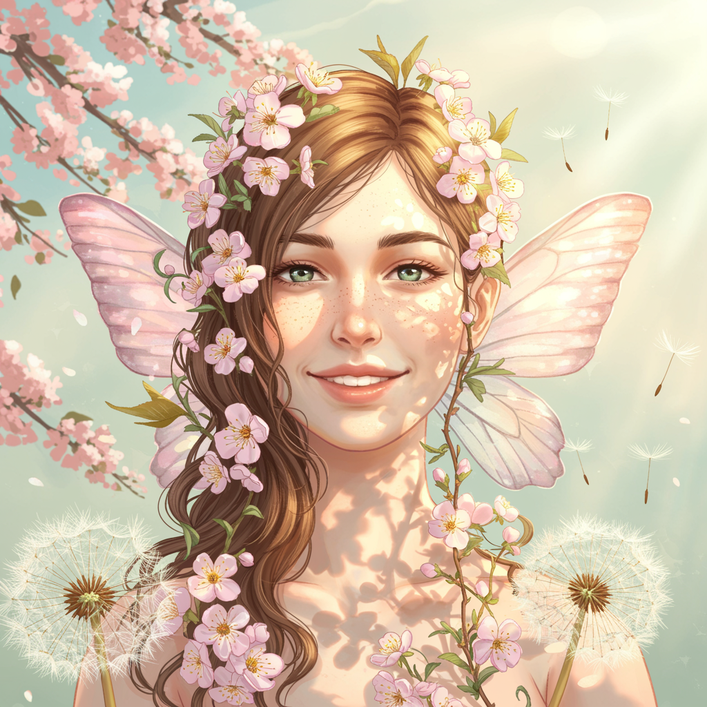 Imagine a whimsical profile picture where a serene, smiling face emerges from a bloom of pastel-colored flowers. The person’s hair flows seamlessly into lush vines dotted with cherry blossoms, while a pair of radiant butterfly wings gently unfurls behind them. Sunlight filters through the petals, casting intricate floral shadows across their features, and a soft breeze sends a flurry of dandelion seeds floating around, each seed gleaming like a tiny, iridescent gem. This spring pfp conveys a sense of renewal and joy, with an ethereal glow that captures the essence of vibrant beginnings.