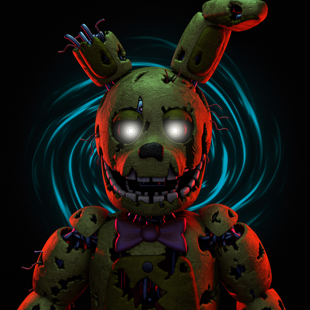 Create a captivating profile picture featuring a stylized, cartoonish anthropomorphic rabbit with tattered, spring-like metallic coils and haunted, glowing eyes, set against a backdrop of swirling neon hues, blending eerie allure with playful charm, capturing the enigmatic essence of springtrap in an imaginative twist.